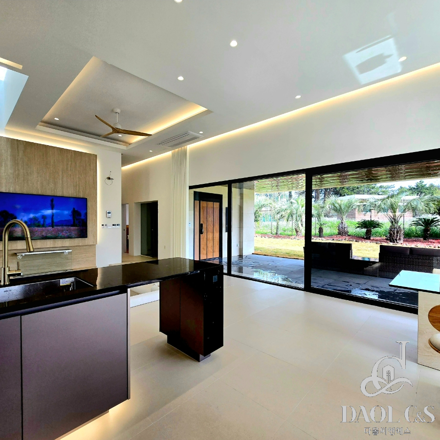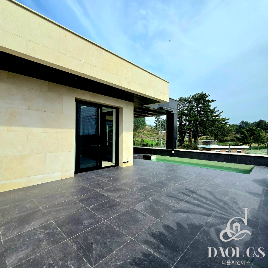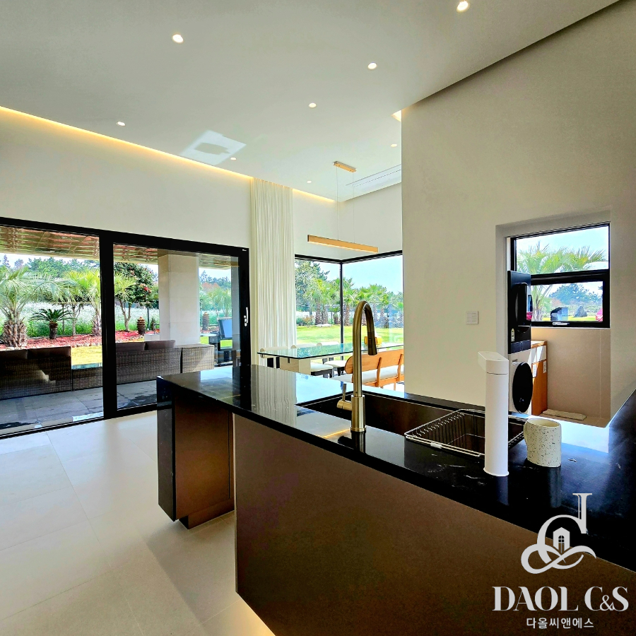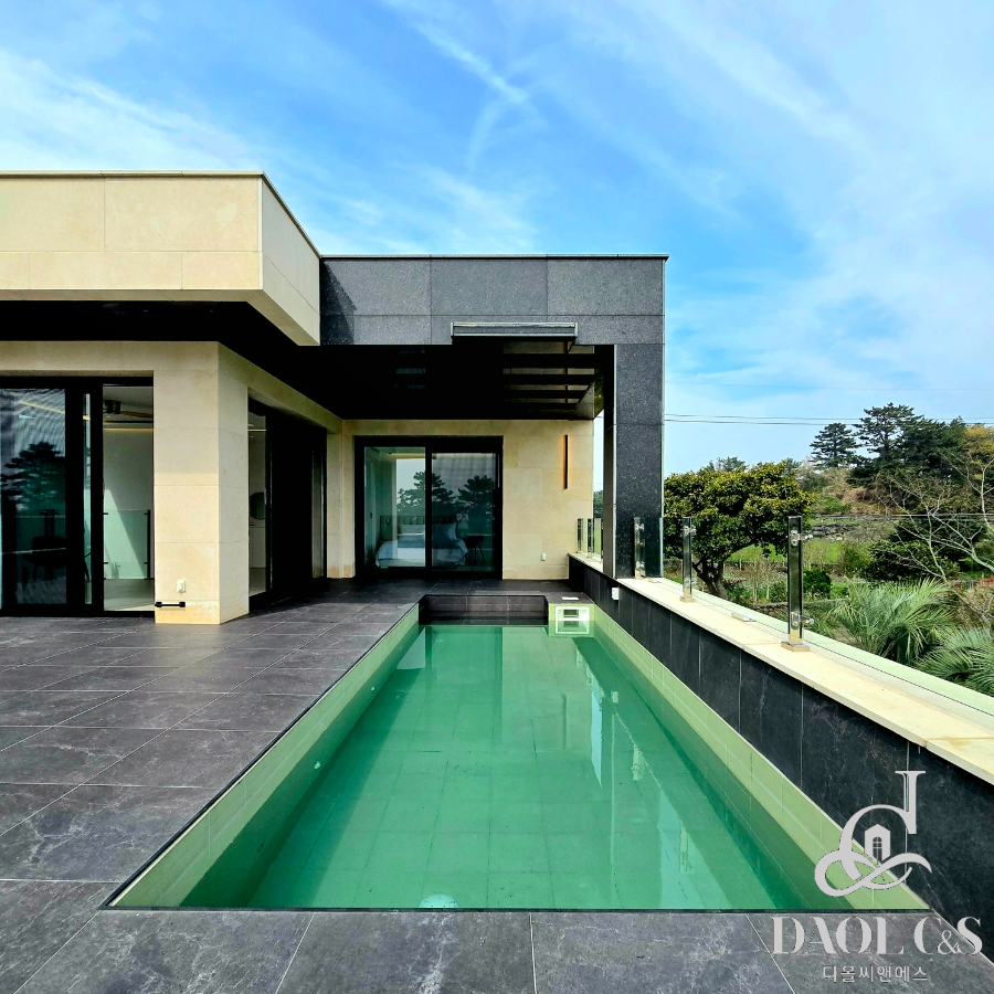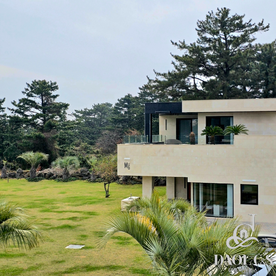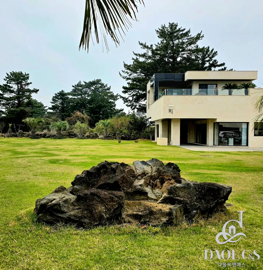 건축주의 정성이 깃든 잘 조성된 정원은 제주스러움을 만끽할 수 있는 야자수와 제주석이 자연스럽게 조화를 이뤄 완성된 제주 애월읍 고급단독주택입니다.